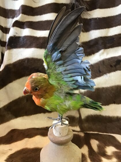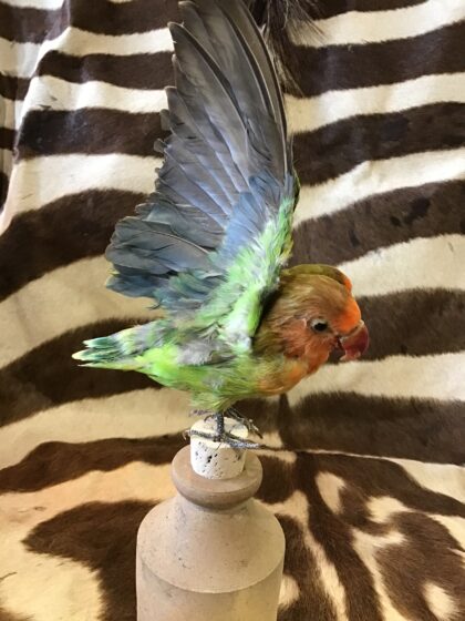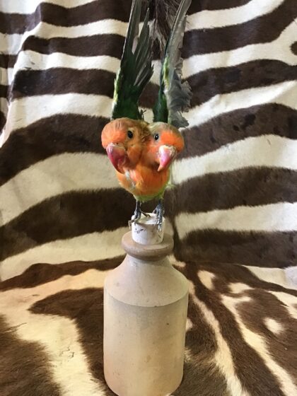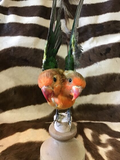 Taxidermy of a lovely little freak of nature. A lovebird with two heads!