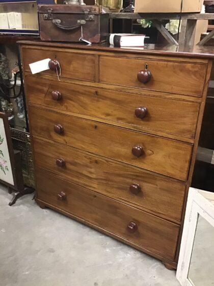 Lovely sturdy and elegant set of solid wood bedroom drawers. Two over four, large size with plenty of storage. 117cm tall, 110cm wide, 50cm deep. Dovetail joins. Round wooden painted knobs.
