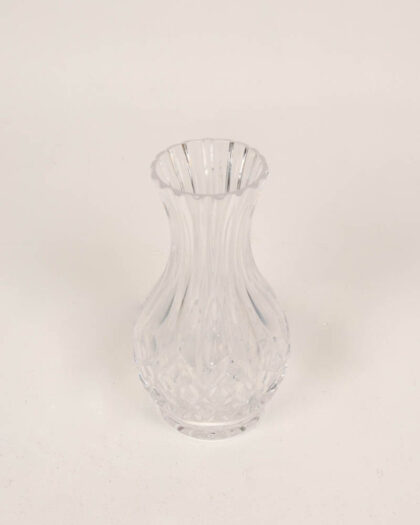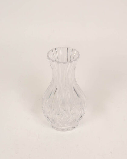 This Tyrone crystal vase features a classic design with a fluted edge and a diamond-cut pattern. 20cm high The vase has a bulbous body that tapers towards the top, leading to the decorative fluted rim. Its clear glass showcases light beautifully. The vase is in very good condition with no visible chips or cracks. This crystal glass vase would be suitable for displaying small floral bouquets in a living room, dining room, or bedroom.