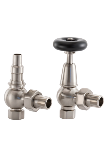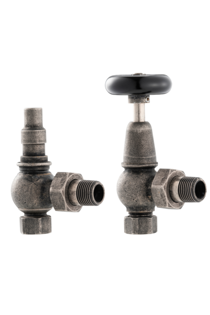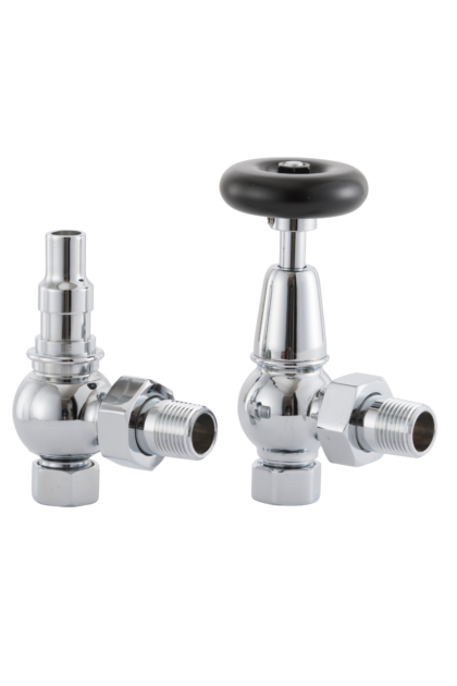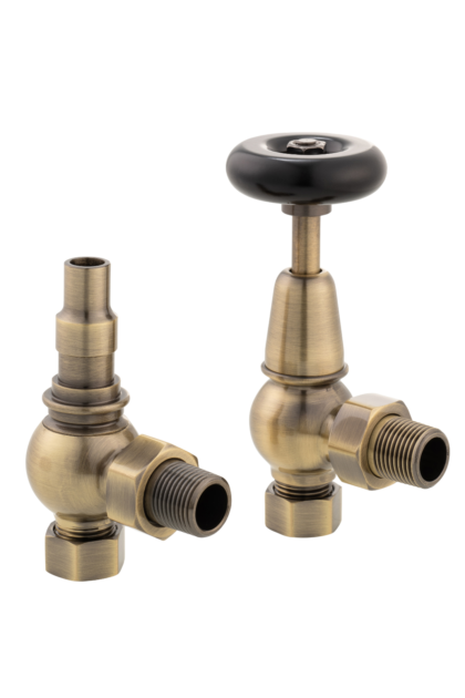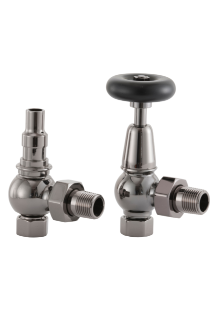 The UK20 is a traditional angled manual radiator valve set with an FSC certified black wooden wheel design. It comes with 2 valves, the wheel head, and lock shield.