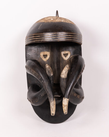 This striking tribal mask is crafted from wood, featuring a dark, possibly stained finish, and highlights of white on the nose and tusk-like protrusions. The design includes geometric shapes, such as triangular eye openings, and textured accents. The overall form is slightly aged, with visible wear that adds to its authenticity and character. The back of the mask reveals the raw wood, providing a contrast to the darker front. The mask can be displayed on a wall thanks to an attached wire. This African mask is a unique decor piece to add cultural character to any room. There are slight imperfections on the mask due to age and style.