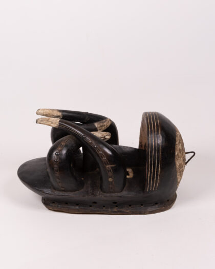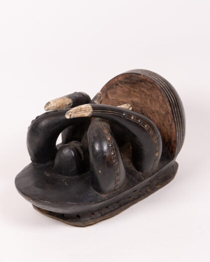 Unique Cameroon tribal mask featuring dark wood, white geometric shapes, symbolising the Hippo. These would be worn on the head of dancers at ceremonies.