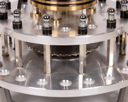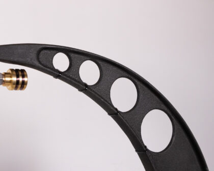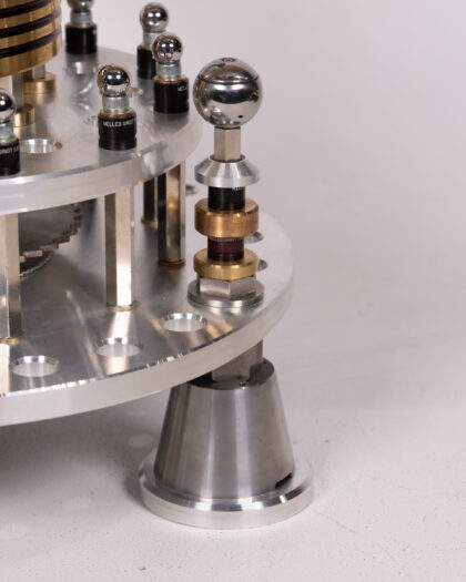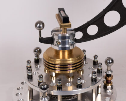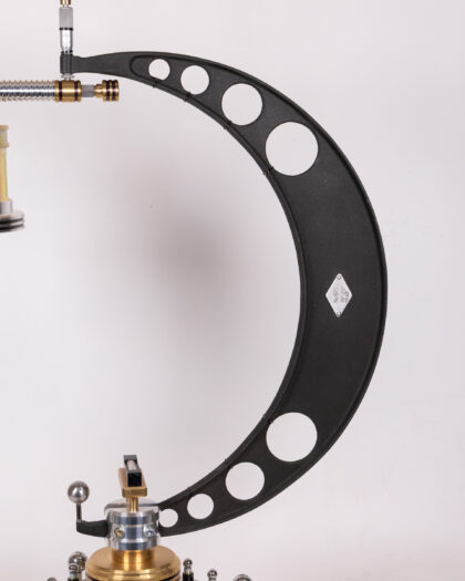 This unique table lamp has been created from a vintage micrometer and custom-machined parts by a local craftsman. The industrial design will add character to any room. The base and lamp head are constructed from aluminium, with a brass centre to the base, which also features steel bolts. The curved arm of the lamp is the micrometer itself. A great gift for anyone into science or engineering.