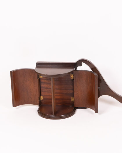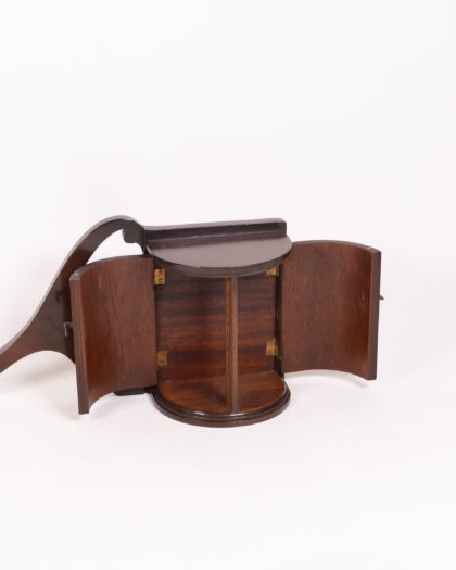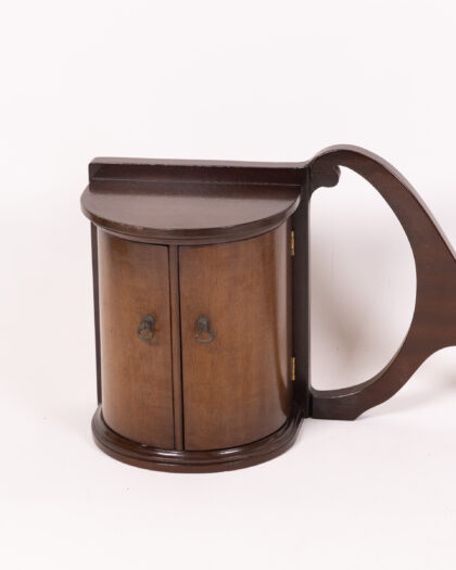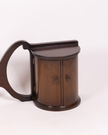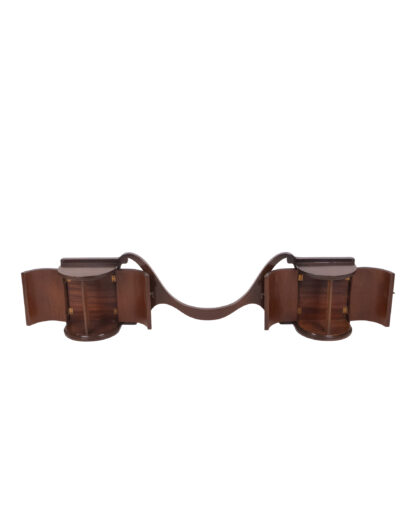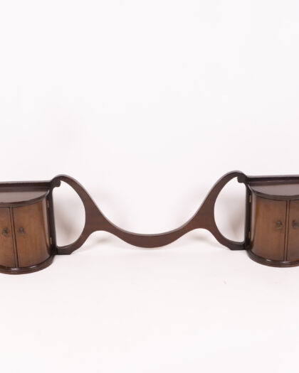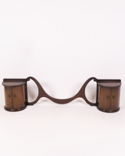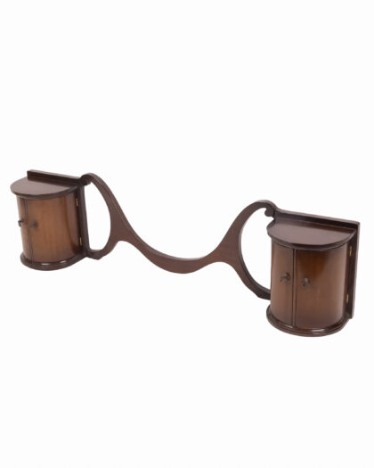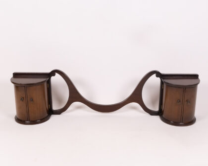A unique, wall-mounted hanging cabinet featuring a central connecting bar between two cylindrical cabinets. Each cabinet has two hinged doors opening to reveal a shelved interior. The cabinet is finished in a dark brown tone and is in good condition. The unusual design would bring a sophisticated storage solution to any room.