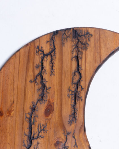 This is a unique and decorative wooden bowl. Crafted from natural wood, it features a crescent moon shape. The most striking feature of this bowl is the fractal Lichtenberg patterns burned into the wood. These patterns resemble branching trees or lightning strikes, adding a touch of natural artistry to the piece. The bowl's surface is smooth and finished, enhancing the wood's natural grain and colour. This wooden bowl is a wonderful addition to your home decor. It can be used as a decorative item. It could also be used to hold trinkets.