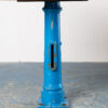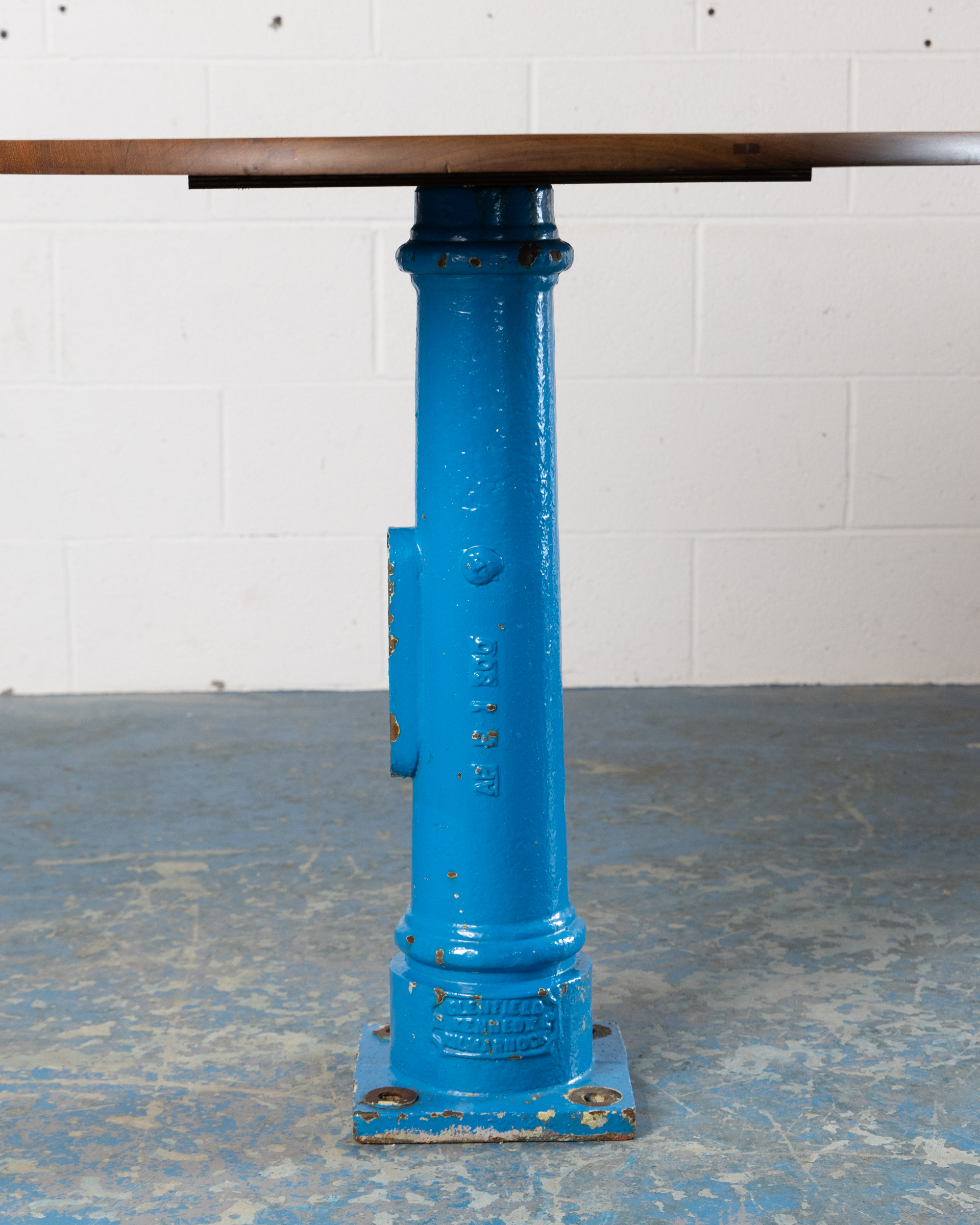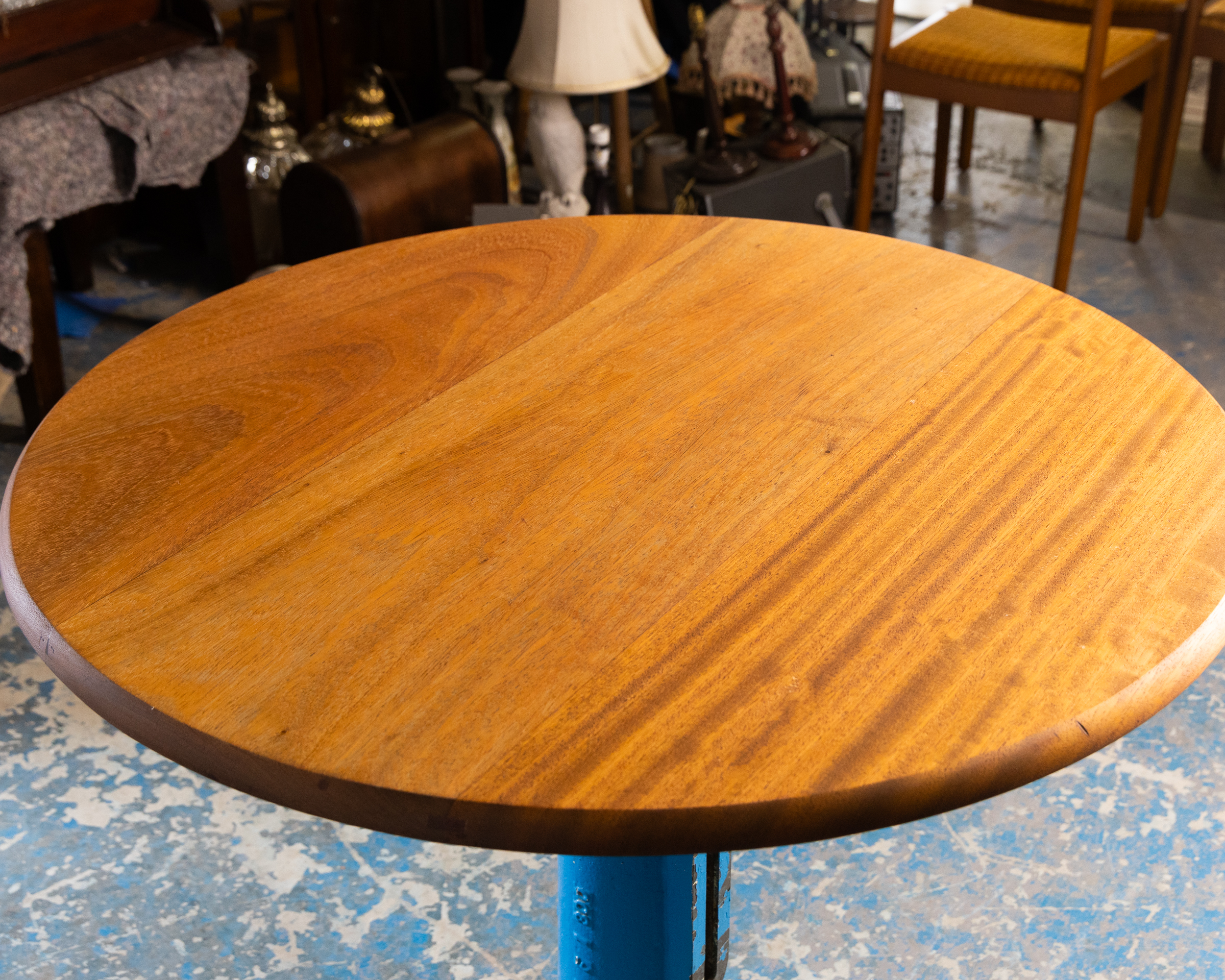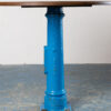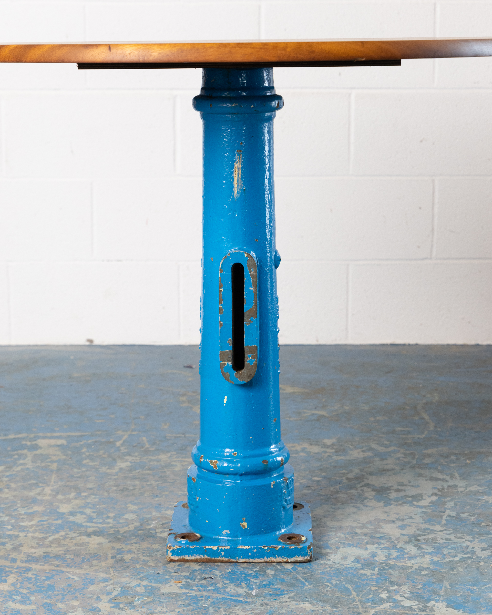 Upcycled teak table top with a cast iron lamp post base from Kilmarnock. Beautiful royal blue base! Stand out from the crowd with this one!