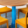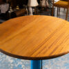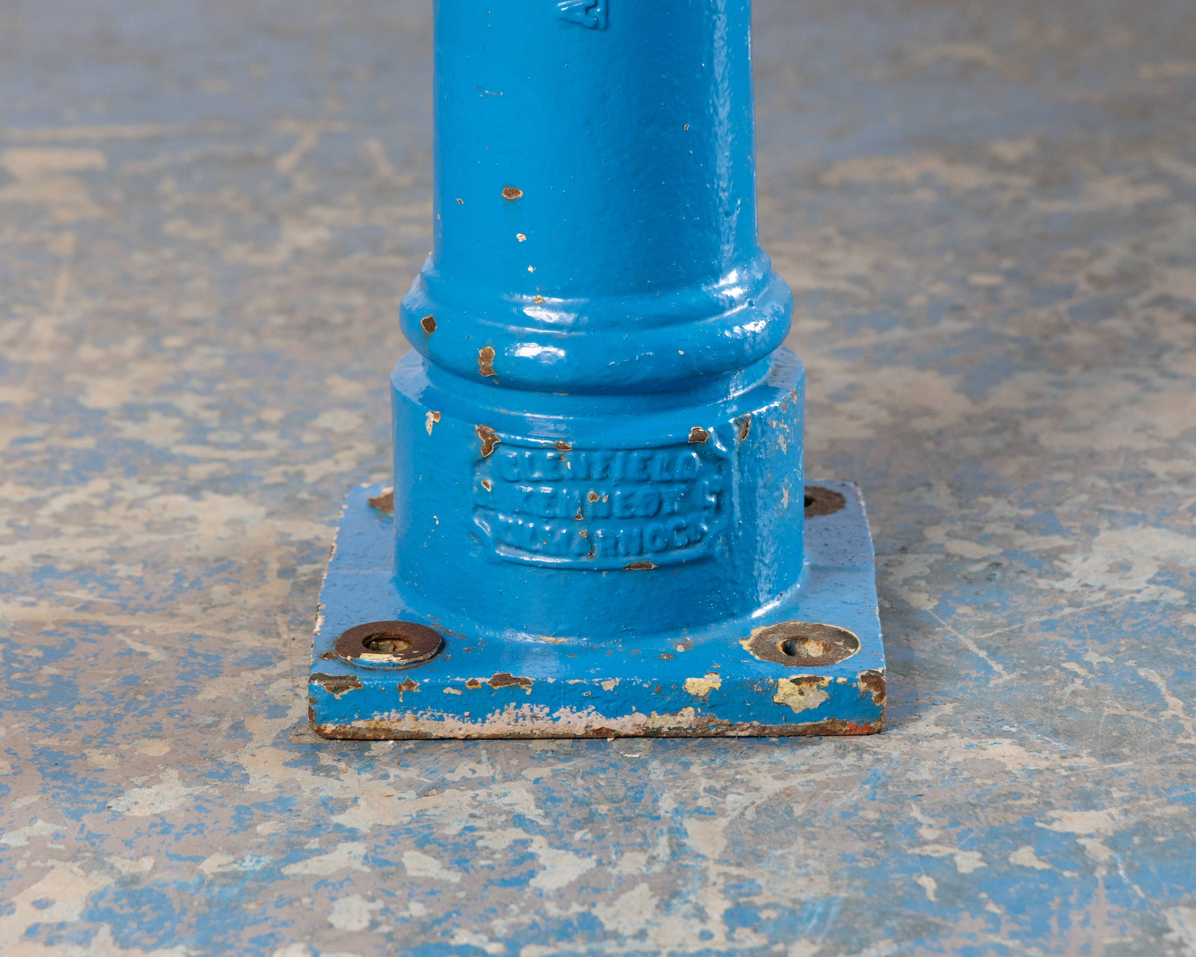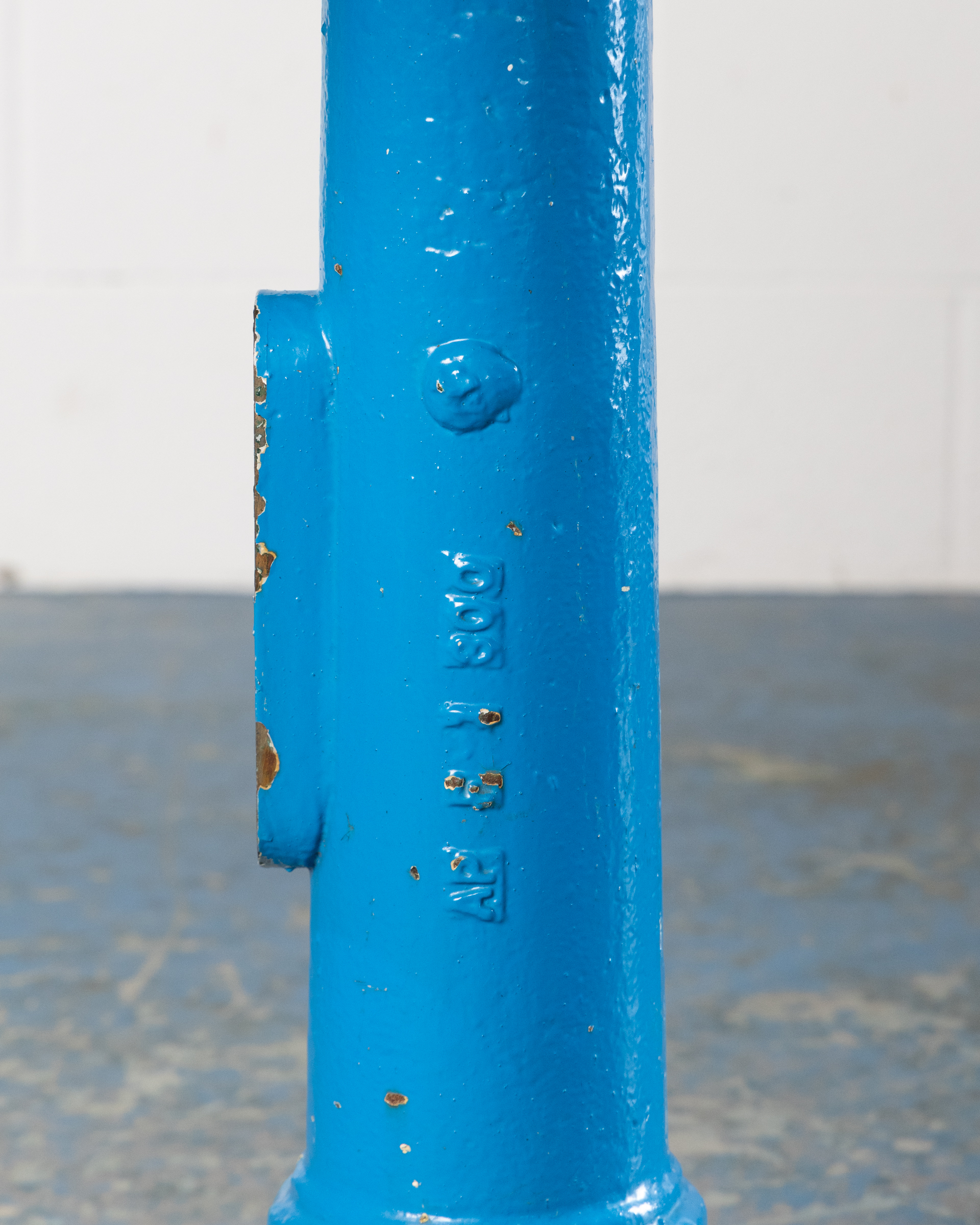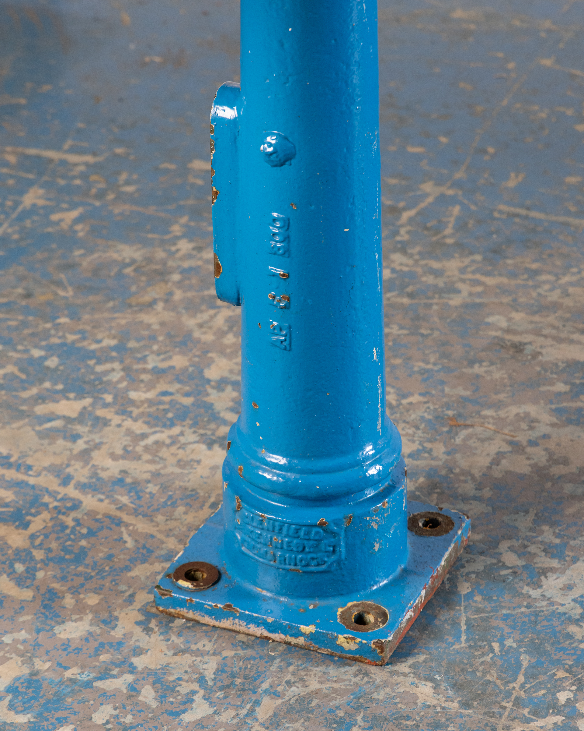 Upcycled teak table top with a cast iron lamp post base from Kilmarnock. Beautiful royal blue base! Stand out from the crowd with this one!