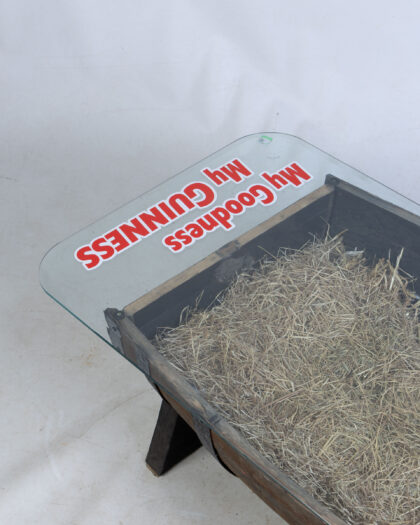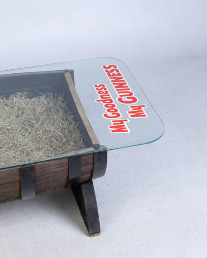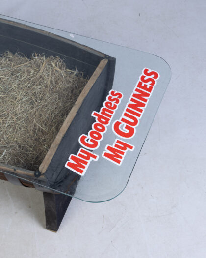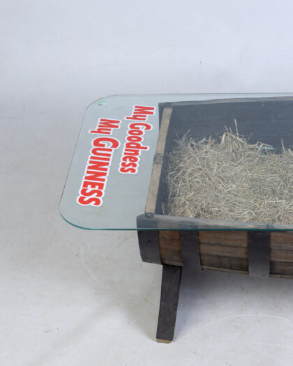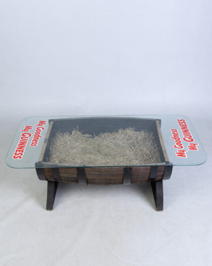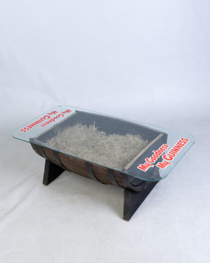 Discover a truly unique statement piece for your home with this Upcycled Guinness Barrel Coffee Table. Expertly transformed from an authentic Guinness barrel, this distinctive table brings a touch of Irish charm and industrial rustic appeal to any space. The original barrel has been meticulously cut, stained, and treated to form a sturdy base, complemented by repurposed black wooden feet. A clear glass top, beautifully adorned with the iconic 'My Goodness My Guinness' branding in vibrant red, provides a practical surface while showcasing the barrel's intriguing interior. Filled with natural hay for aesthetic appeal, this one-of-a-kind coffee table is more than just furniture; it's a conversation starter and a testament to creative reuse. Perfect for a home bar, living room, or man cave, it offers both functionality and a captivating visual element for any beer enthusiast or collector of unique decor.