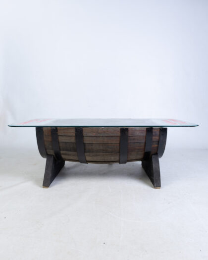 Unique Upcycled Guinness Barrel Coffee Table with Branded Glass Top, perfect for home bars and living spaces.