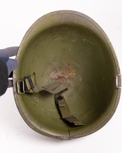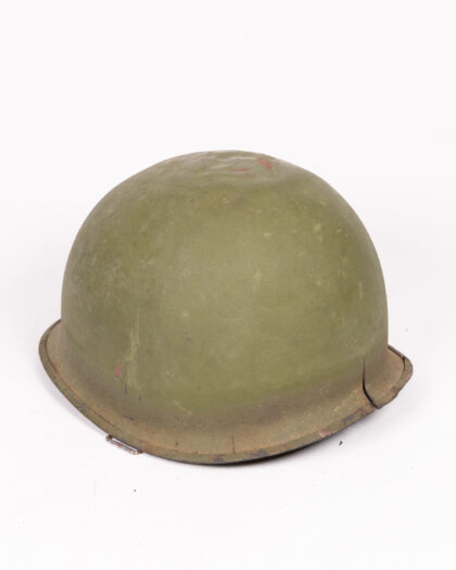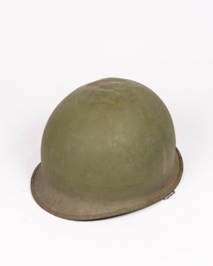 Original US Army M1 helmet in olive drab. Vintage military collectible with webbing, adjustable straps and wear consistent with age.