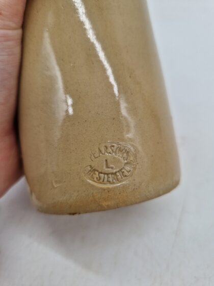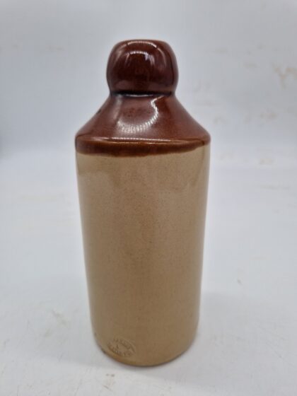 A brown, two-tone glazed stoneware bottle bearing black lettering which reads, "Usborne Ginger Beer "None Nicer" Brand Guaranteed Brewed Ascott-Under-Wychwood". Bears impressed Pearsons Chesterfield makers mark.