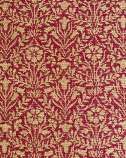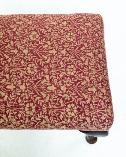 This vicorian footstool features a red and gold floral patterned fabric by William Morris Bellflowers Weave upholstery that gives a classic aesthetic. The stool has four dark wood cabriole legs. The floral pattern has a traditional botanical design. The wood has a rich patina from age. The footstool can be used in a living room, bedroom, or lounge. It would be a great addition to any room needing a touch of extra comfort.