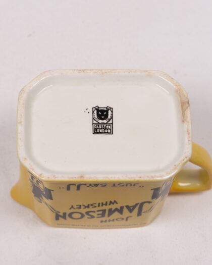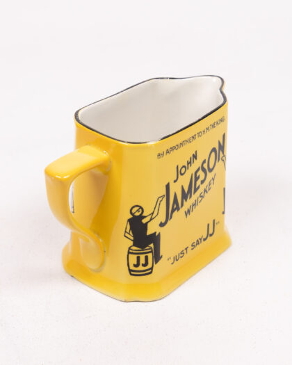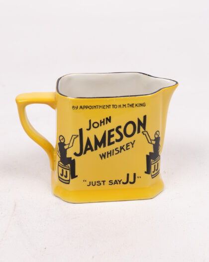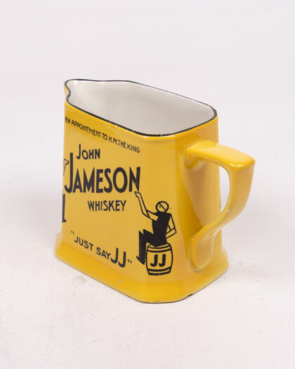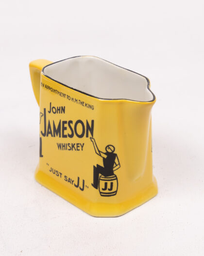 This is a 1920s Causton London ceramic jug advertising John Jameson Irish Whiskey. The jug is yellow with black and white accents, featuring graphics of a man sitting on a JJ branded barrel, with 'Just Say JJ' written on the base. It also features "By appointment to H.M. The King" written in black along the top. On the base, the Causton London logo is present. This item would make a great addition to any barware collection. In good condition.