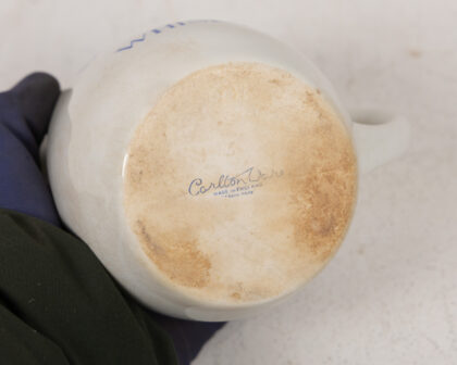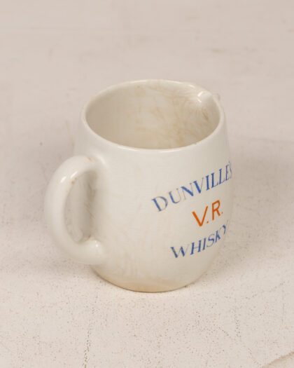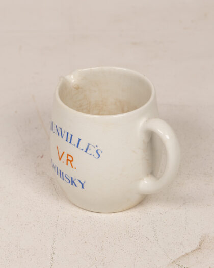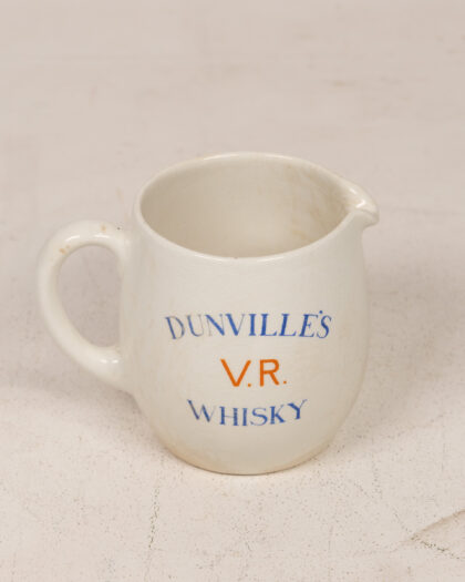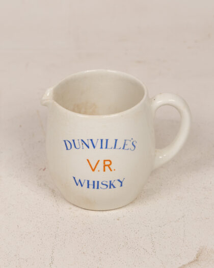 Vintage Carlton Ware Dunville's V.R. Whisky advertising jug. This cream-colored ceramic jug features blue and orange text advertising Dunville's V.R. Whisky. Made in England, it's a charming piece of breweriana. The jug is in good vintage condition, with some staining on the inside and base, which adds to its authentic appeal.
