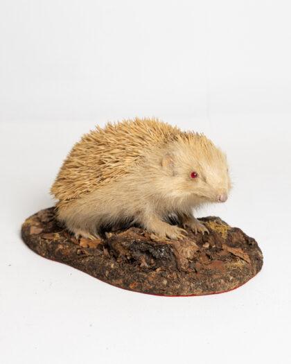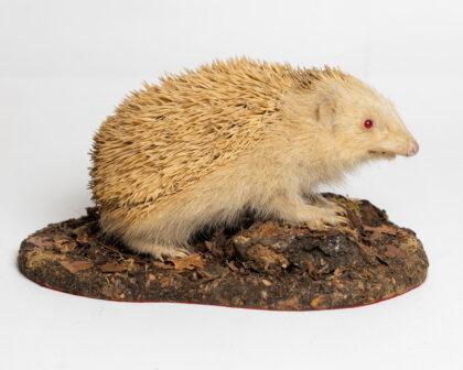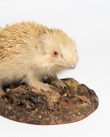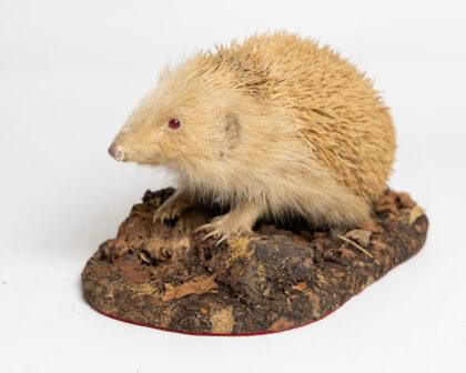 A very rare, taxidermy albino hedgehog mounted on naturalistic base.