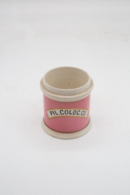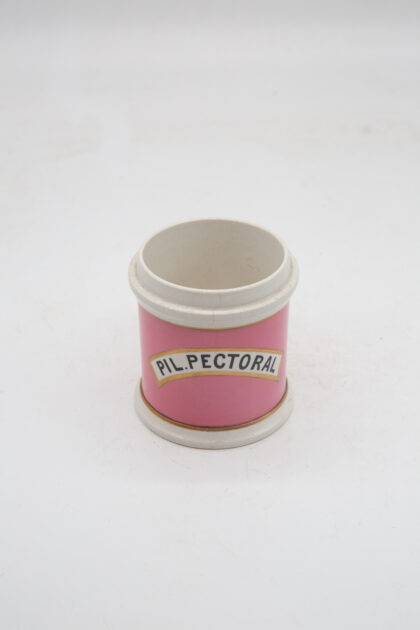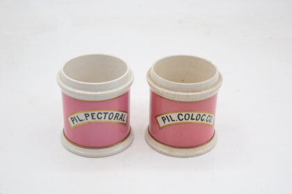 A pair of Victorian, pink glazed ceramic apothecary jars. Both are missing their lids. One is labelled "PIL. PECTORAL", and the other, which has a chip to the lip, is labelled "PIL. COLOC. CO.".