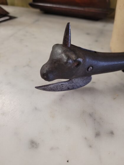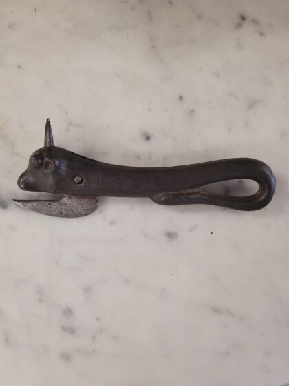 A Victorian metal tin opener in the form of a cow.