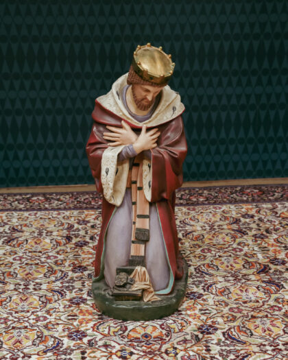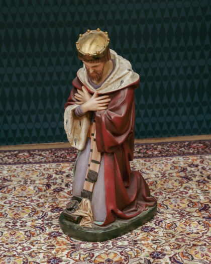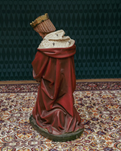 A Victorian statue of a wise man kneeling with a crown on. This has been restored, repaired and repainted by a local expert thus brought back to it's original glory.