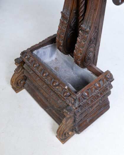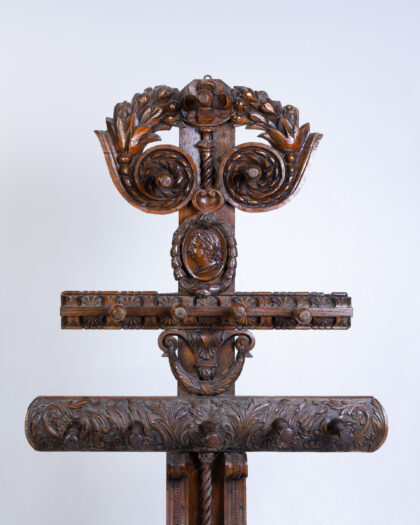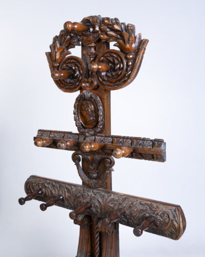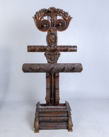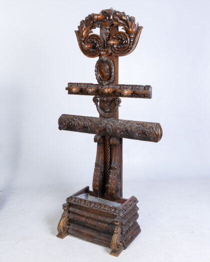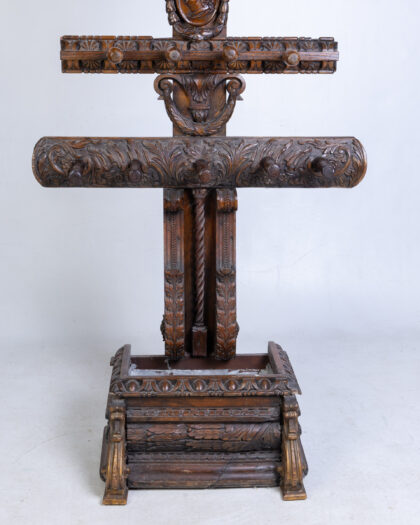 This is a stunning antique hall stand, expertly crafted from oak with intricate carvings. The stand features a decorative top with ornate details and a central portrait medallion. Below are two rows of coat hooks, providing ample hanging space. The base includes an umbrella holder with a metal liner. This piece showcases exceptional craftsmanship and is ideal for adding a touch of elegance to any entryway. Note some wear consistent with age.