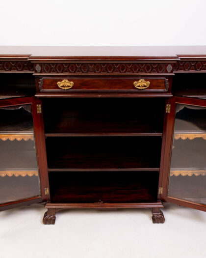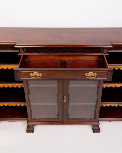 The cabinet features a drawer above the glass doors. Each of the side sections of the cabinet has three shelves trimmed with scalloped gold-coloured fabric. The cabinet has ornate carvings around the top and on the legs. The glass doors have decorative wooden trim around them. The cabinet is in good condition overall with some minor wear consistent with age, including some light surface scratches and minor chips to the wood in places. This cabinet would be a lovely addition to a living room or dining room.