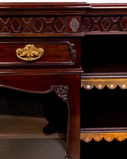Vintage mahogany display cabinet with ornate details, glass doors and brass handles. Features multiple shelves. Some wear consistent with age.