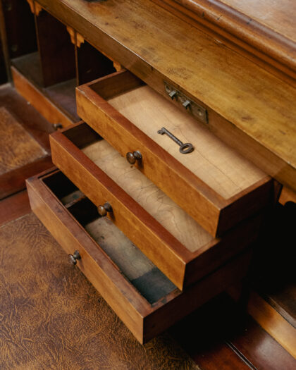 Features pull-out desk and raisable writing surface with two sets of drawers either side of the kneehole as well as smaller storage behind the desk.