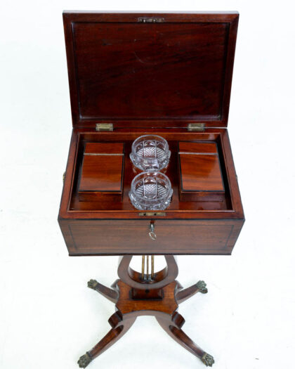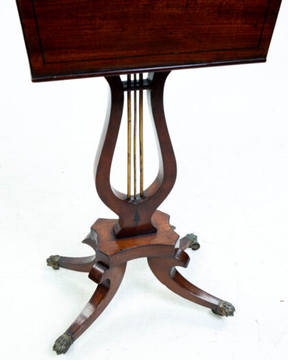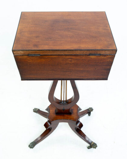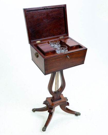 Victorian mahogany drinks table. The top opens to reveal internal divisions. Supported on a lyre base with brass supports and claw feet. Good condition.