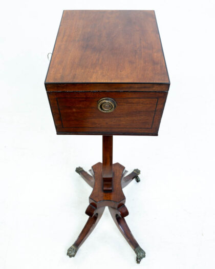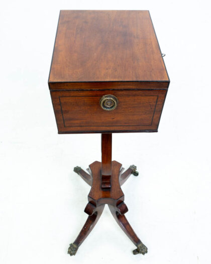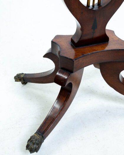 This is a Victorian drinks table, crafted from rich mahogany. The table features a lift-top that opens to reveal compartments for bottles and glasses. The table is supported by a distinctive lyre-shaped base with ornate brass supports and four splayed legs ending in claw feet. A central drawer with key lock and ornate circular brass knob adds to the charm. The dark wood has a beautiful patina from age and use. The brass feet show some wear. This drinks table would make a wonderful addition to a living room or home bar.