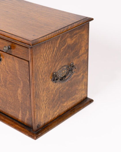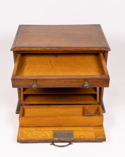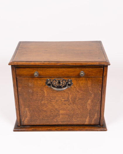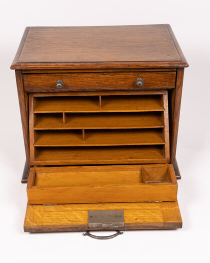 This is a beautiful Victorian oak and elm correspondence box. The item features a drop down writing platform and multiple internal letter racks. The box has attractive patination, commensurate with age and use. The box is in very good condition for its age.