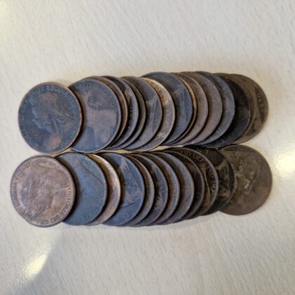 These Bronze Pennies are over 100 years old! tThe "Bun penny", named for the hairstyle of Queen Victoria on it, was issued from then until 1894. The final years of Victoria's reign saw the "Veiled head" or "Old head" pennies, which were coined from 1895 until her death in 1901