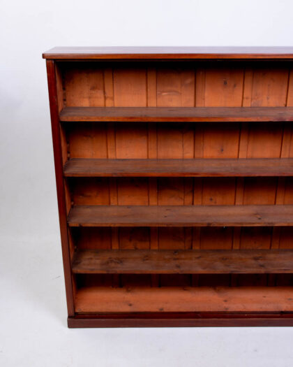 This is a good size solid mahogany open front bookcase (143cm long x 145cm high). Made around middle of the 19th century for a Grand House. Open front bookcases of this size and era are very hard to come by. This would suit a living room, office hall or large stair return.