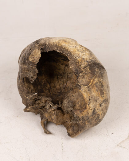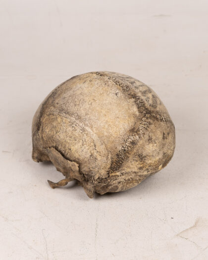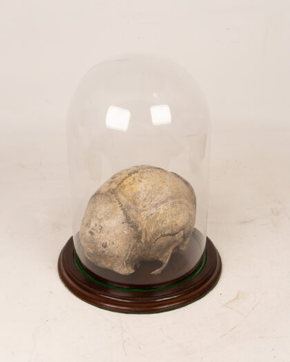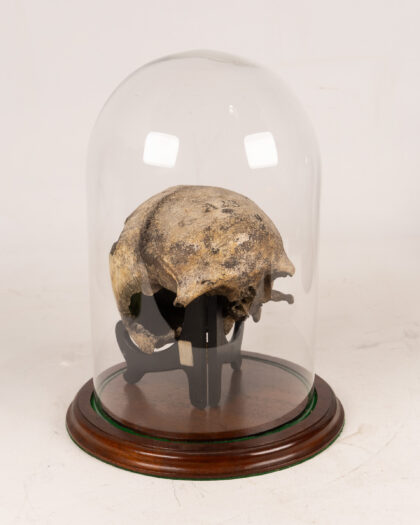 This is a fragment of a real human skull displayed under a glass cloche dome.