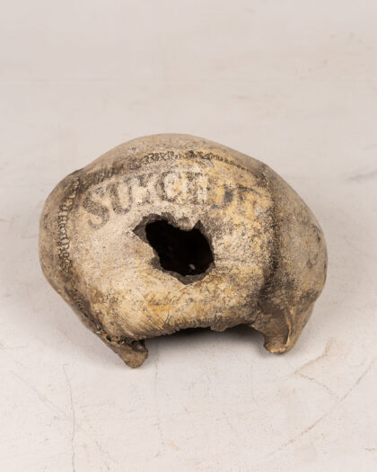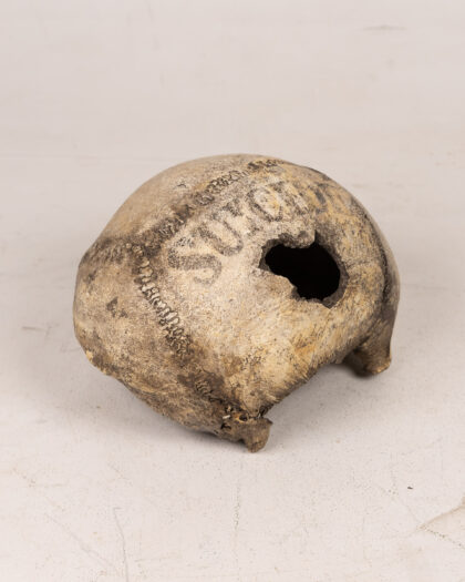 Vintage human skull fragment under glass dome. Decorated with lettering. Unique and macabre curio for collectors. Inscribed with word 'SUICIDE'.