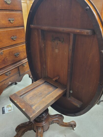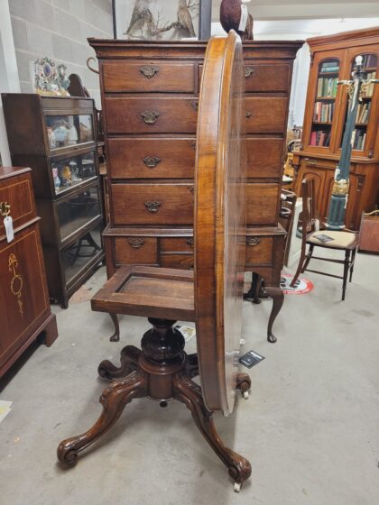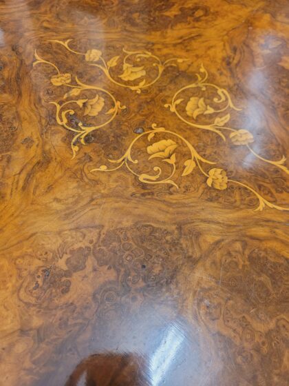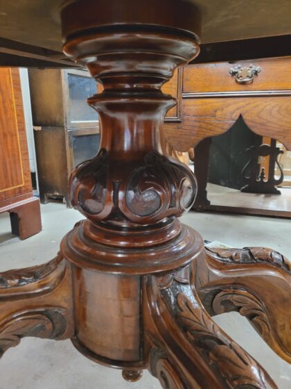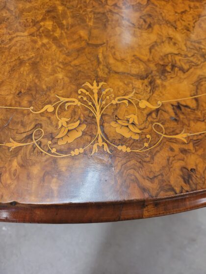 A large Victorian pedestal, tilt-top table with stunning veneer and marquetry inlay.