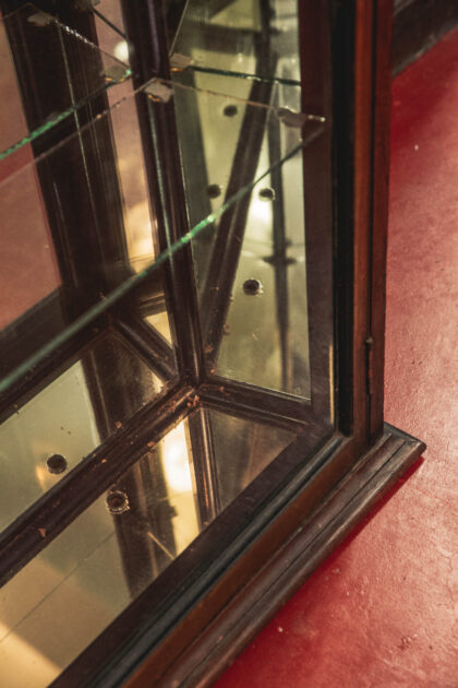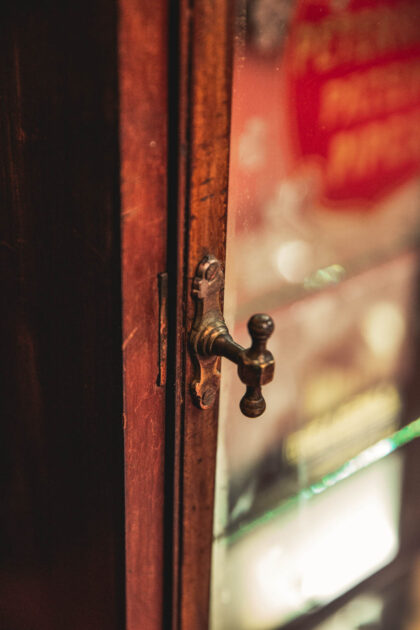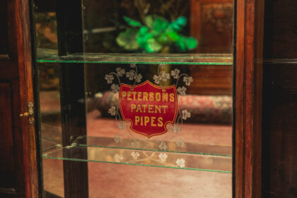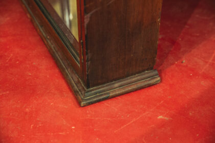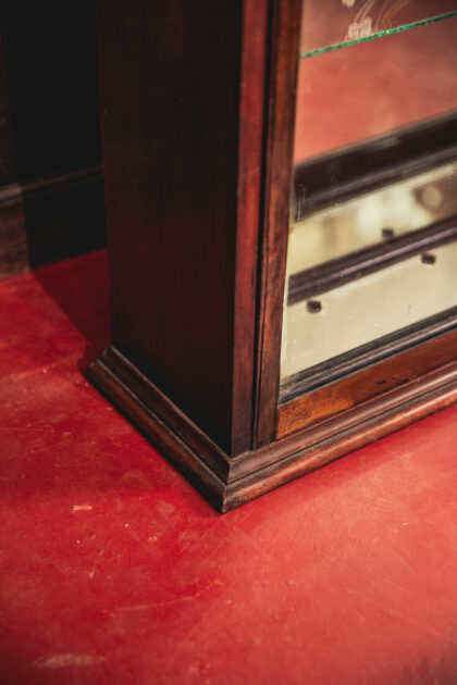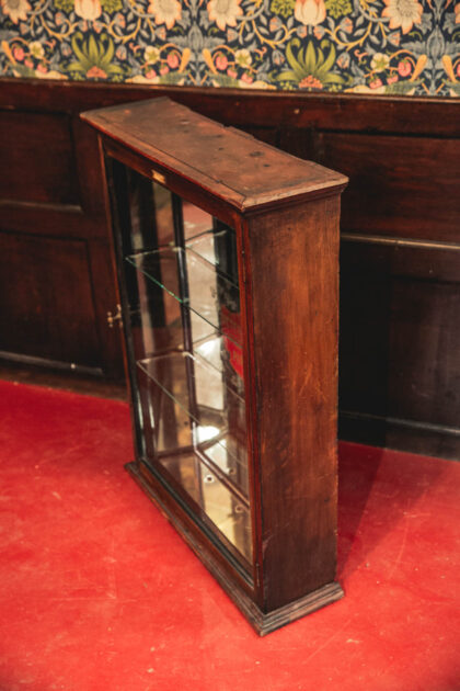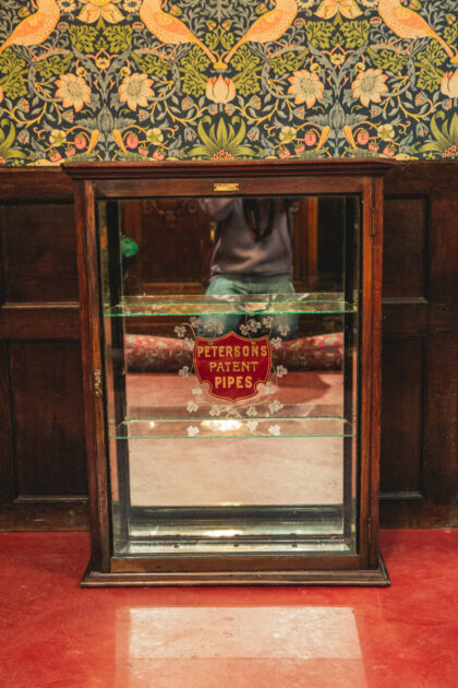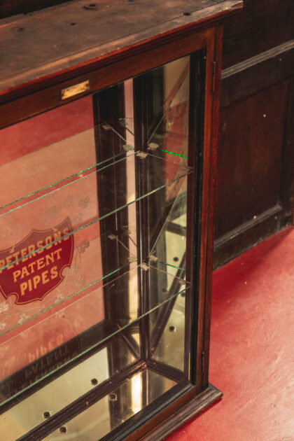 A Victorian, glazed display cabinet with mirror back made for Petersons Patent Pipes. Features two glass shelves. The emblem is back etched and gilded.