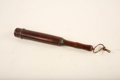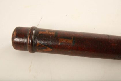 A painted and ebonised Victorian policeman's truncheon; decorated with V. R. 1; with rurned handle and leather strap; 40cm long overall