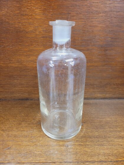 A clear glass Victorian scent bottle. The stopper is stuck inside the top.