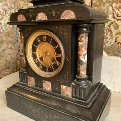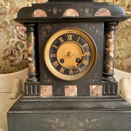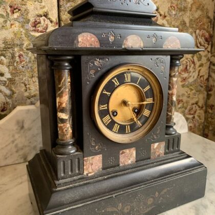 Victorian mantelpiece clock. Slate body with marble inlays.