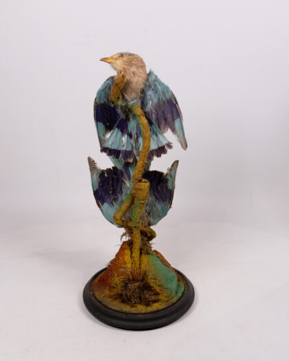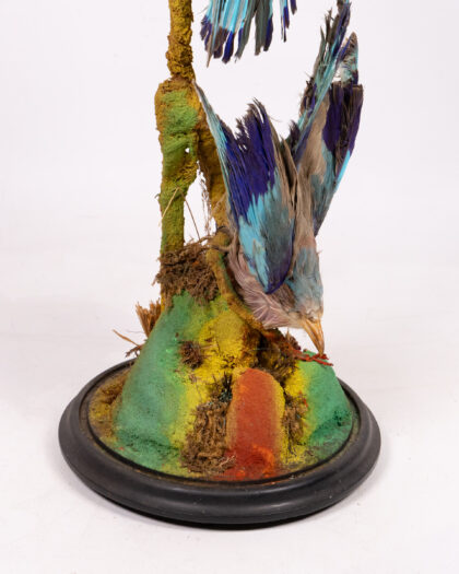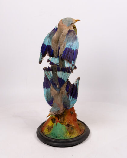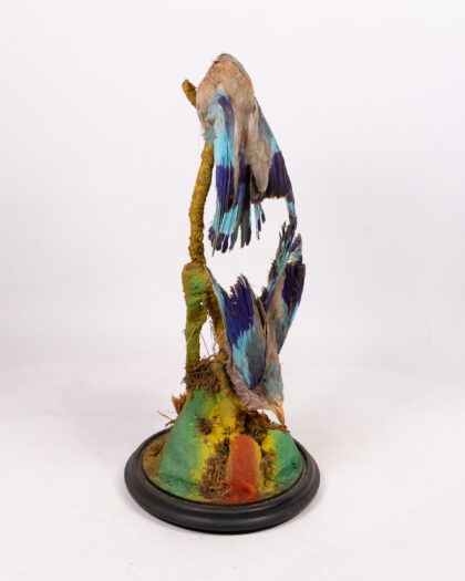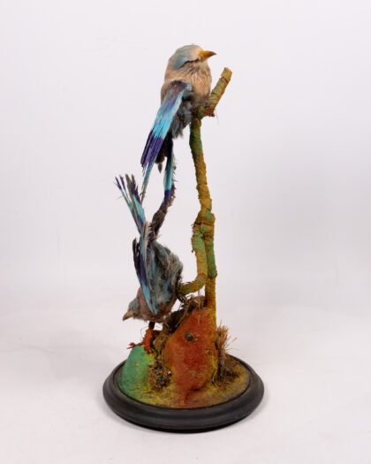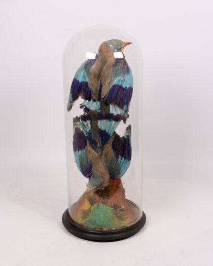 This is a striking example of Victorian taxidermy, featuring a pair of Indian Roller birds (Coracias benghalensis) displayed within a classic glass dome. The birds are mounted on a decorative branch, and the base is finished with a traditional black wooden stand. The plumage displays beautiful shades of blue and brown. This piece has been well-preserved, the glass dome protecting it from dust and damage. Ideal for adding a touch of vintage charm and natural history to any room, this taxidermy display is a conversation starter and a unique collectible. The condition is consistent with age, with some minor wear to the base and slight fading of the feathers, which adds to its antique character.