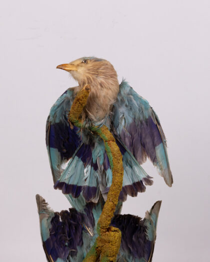 Victorian taxidermy pair of Indian Roller birds in a glass dome. A unique, vintage decor piece showcasing natural beauty & historical craftsmanship.