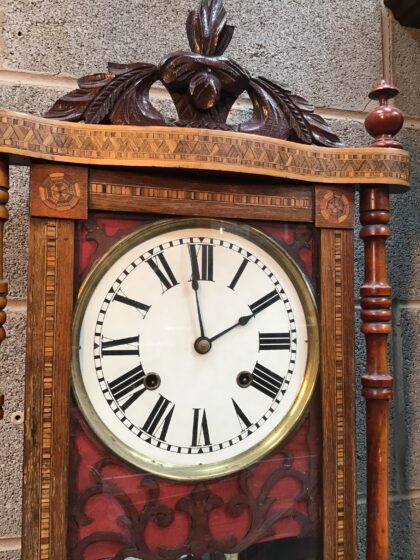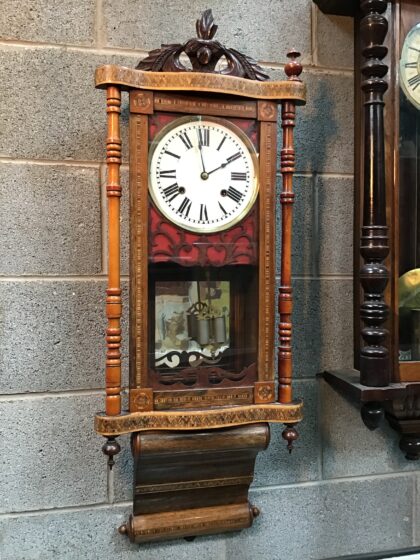 Elegant and interesting wall clock with framed painted face, and intricate marquetry across the case. Double-weighted pendulum swinging against a mirrored back.
