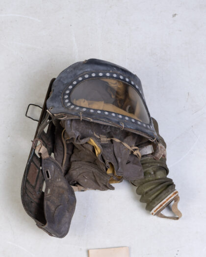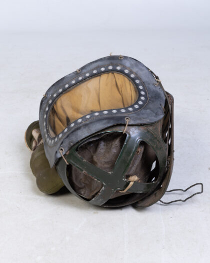 Discover a rare piece of wartime history with this authentic Vintage 1939 Home Office Air Raid Precautions Department anti-gas protective helmet, complete with its original connected respirator. Designed for babies and young children during the pivotal era of WWII, this unique collectible offers a tangible connection to the past. The helmet is expertly constructed from durable rubberized fabric, featuring a clear celluloid visor that allowed visibility. The attached respirator boasts green corrugated rubber tubing, complemented by intricate metal and fabric fittings, all indicative of period manufacturing. The helmet's edge is detailed with metal studs, adding to its authentic appeal. This significant artifact is accompanied by its original instruction booklet, "Home Office Air Raid Precautions Department: Anti-Gas Protection of Babies and Young Children," printed by His Majesty's Stationery Office in 1939, providing invaluable historical context and operational instructions. An exceptional find for military history enthusiasts, collectors of wartime memorabilia, or those seeking a truly distinctive decorative piece.