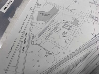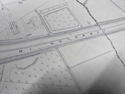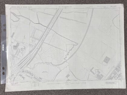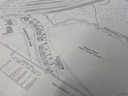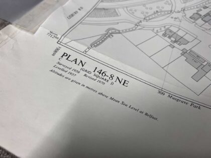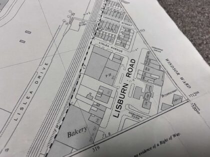 The map covers a large portion of land between the M1 motorway and Lisburn Road, prior to the construction of Boucher Road and the surrounding amenities.
