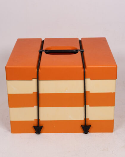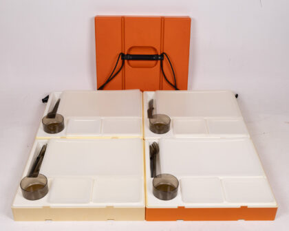 Vintage orange and cream striped picnic set, dating from the 1970s. This quirky set features an orange and cream striped box made from plastic with black string and plastic clip fastenings. When opened, it contains four compartmentalized trays. Each tray contains space for a plate, cup, cutlery, and two other spaces, each containing matching dark brown cutlery and cups. There are some surface marks and scratches to the plastic consistent with age and use.