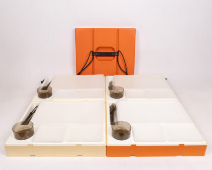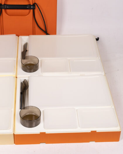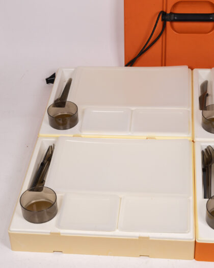 Vintage 1970's Orange and Cream Striped Picnic Set. Contains 4 trays with cup and cutlery slots with included cups and cutlery. Great for outdoor dining.