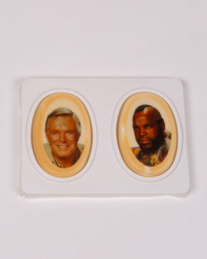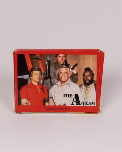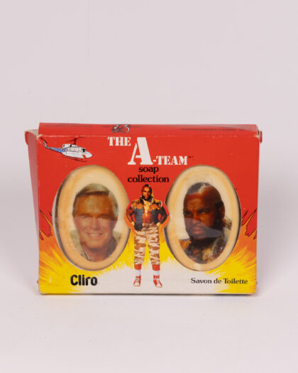 This is a Clito A-Team soap collection. The original packaging is present with the A-Team branding and a picture of the famous van. The soap itself has images of the actors from the show. There are two soap bars per set, each in an oval shape, and the set is designed to look like the A-Team characters are standing side-by-side. The packaging shows signs of wear and tear. The soap is vintage, dating from the 1980s, and therefore would be considered as a collectible item.