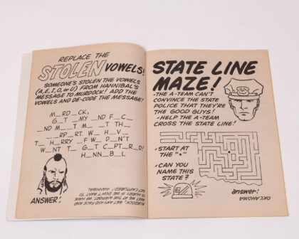 Vintage 1983 A-Team Activity Book. A fun piece of 80's pop culture, this activity book is filled with puzzles and games. Features images of the A-Team television series. In good condition for its age, there is some minor wear and tear on the cover. Inside pages appear unmarked and unused. A unique gift for someone who loves 80's!