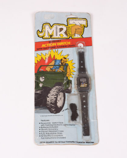 Vintage 1983 Ruby-Spears Enterprises 'Mr. T' reversible action watch with electronic flashing lights. The watch features a black plastic strap and square face with a 'Mr. T' graphic. The watch comes on its original packaging card, which has some wear and tear. Instructions are included on the back. An ideal addition to a collection of retro watches or 'Mr. T' memorabilia. The item hasn't been tested and is sold as seen. Packaging may show wear due to age.