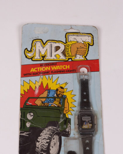 Vintage 1983 'Mr. T' Reversible Action Watch with Flashing Lights! Original packaging. Great collectible for fans or retro accessory enthusiasts.