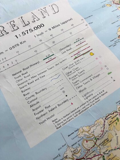 It depicts National roads, Trunk and Link roads, Distance in Miles between towns, Scenic Roads and Views, Railways, Rivers, County Boundaries, Altitude, Airports and more.